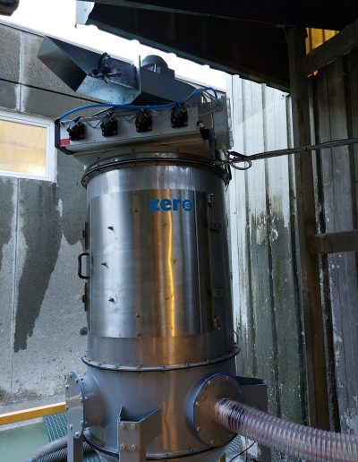 Nous avons installé un dépoussiéreur de 22m³ en inox avec trémie et seau de récupération en tôle peinte.